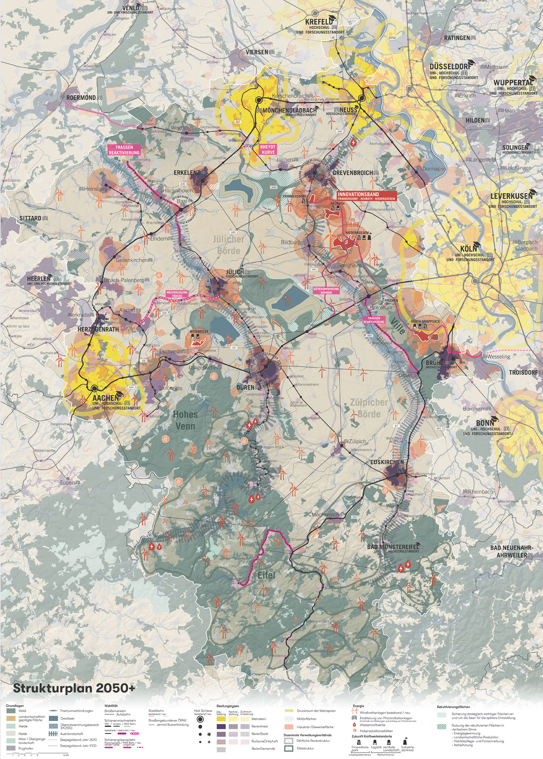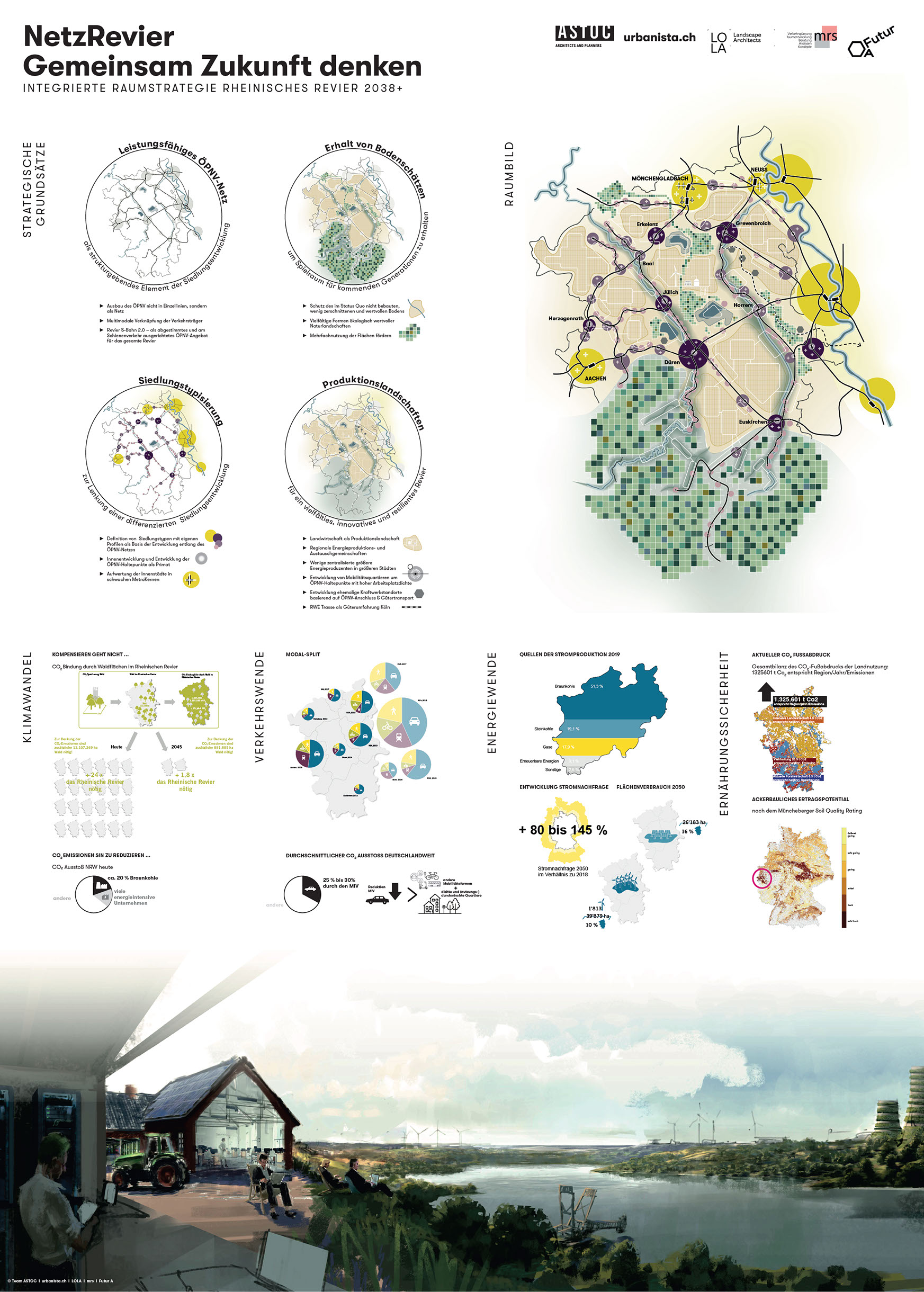 Mit dem Braunkohleausstieg 2038 stellt sich die Frage, in welche Richtung sich das Rheinische Revier entwickeln kann und will. Die Marschrichtung scheint dabei schon festgelegt. Mehrfach wurde betont, dass das Rheinische Revier die erste klimaneutrale Modellregion Europas werden will. Dieses Ziel haben wir für die Integrierte Raumstrategie Rheinisches Revier 2038+ ernst genommen! Die Fragen lauten also: (Wie) kann die Region klimaneutral werden und was bedeutet das für ihre Entwicklung? Und wie kann sie sich gleichzeitig resilient, vernetzt, leistungsstark, innovativ und lebenswert entwickeln?